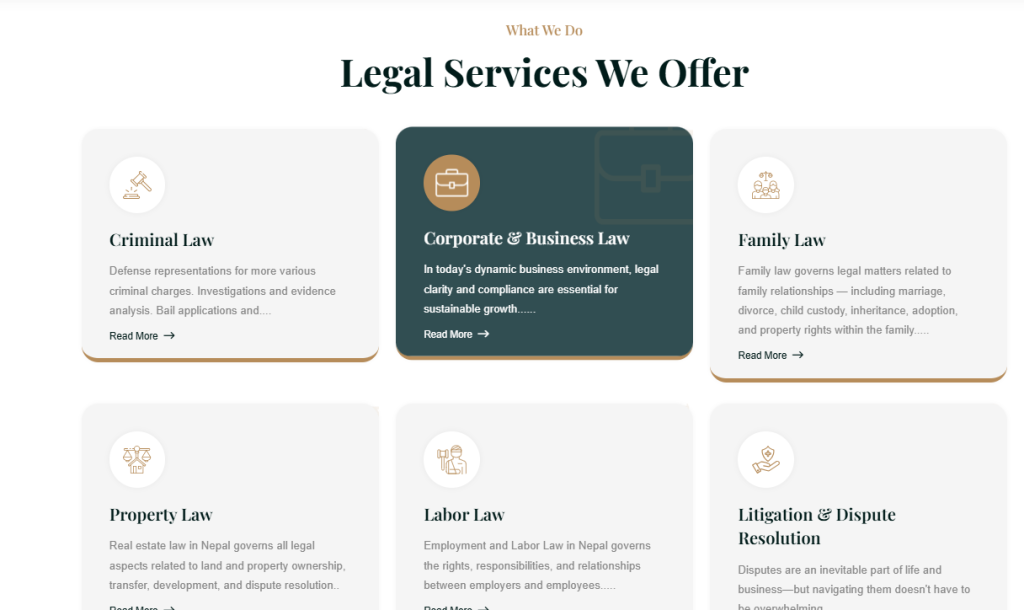Each legal service, including family law, criminal law, property disputes, and corporate law, is presented with easy-to-understand descriptions that help potential clients understand how Legal Victory Associates can assist them.